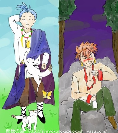 月見酒を楽しんでいる翼宿と、